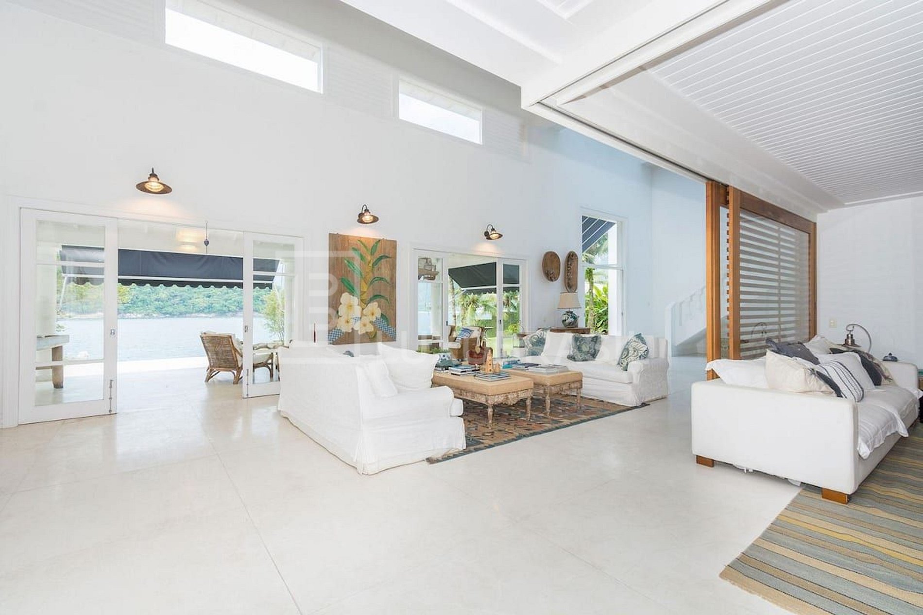 Casa duplex frente ao mar, espaço muito arejado e com muita luz natural, pé direito duplo. Decoração no estilo praiano, com tom rústico e harmonia com a natureza de Angra dos Reis.