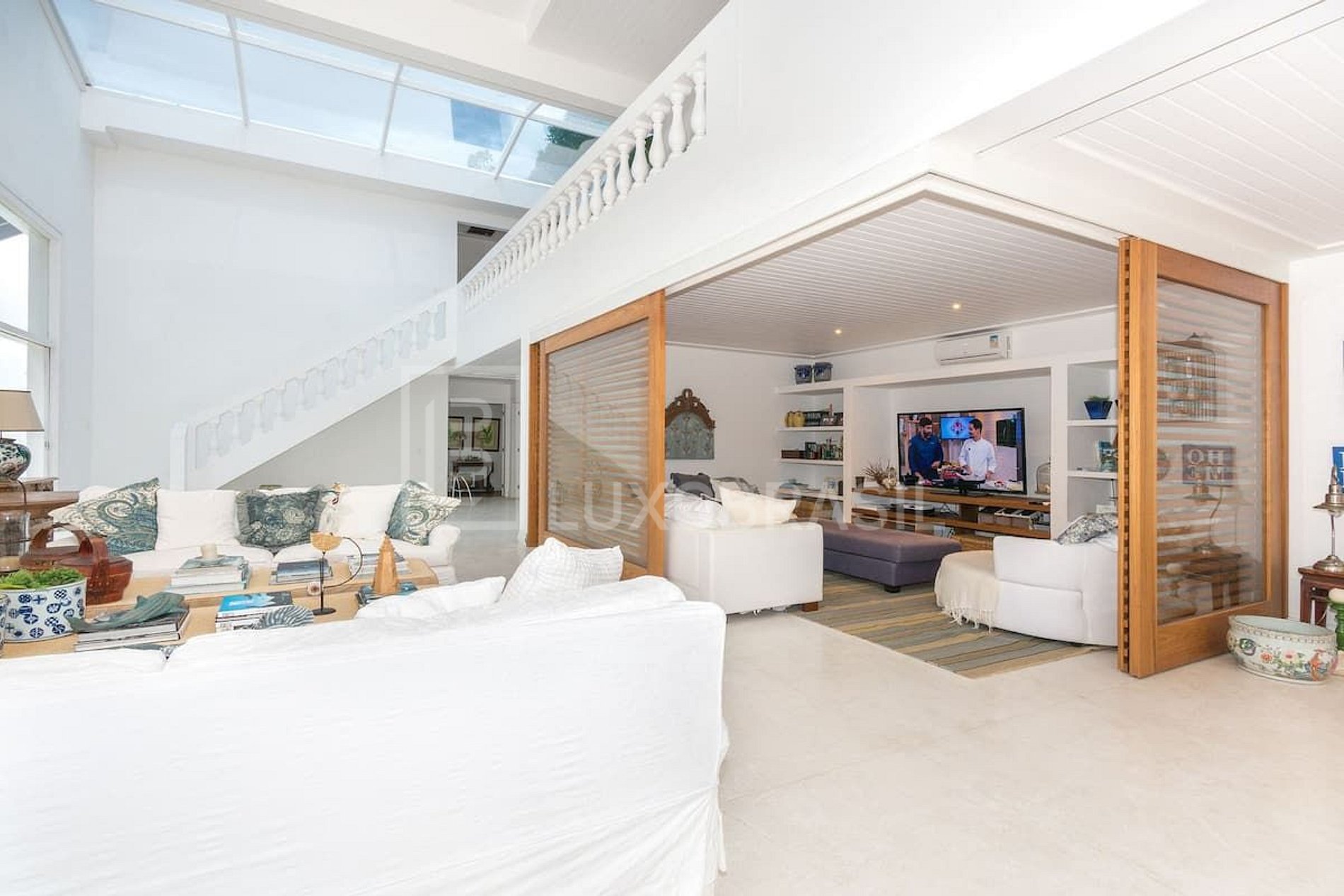 Dispõe de amplas salas de estar, sala de TV, sala de jantar e cozinha totalmente equipada.