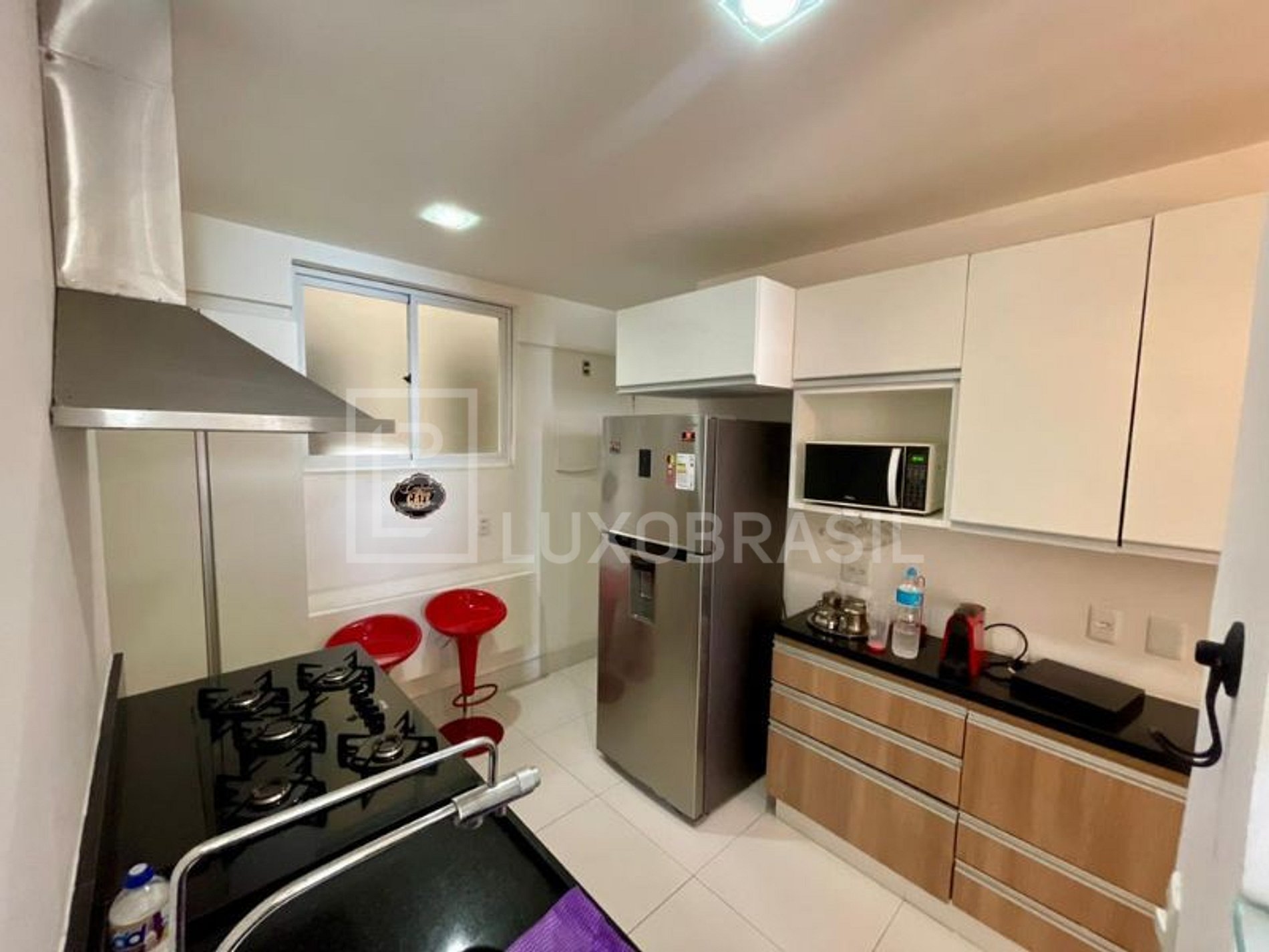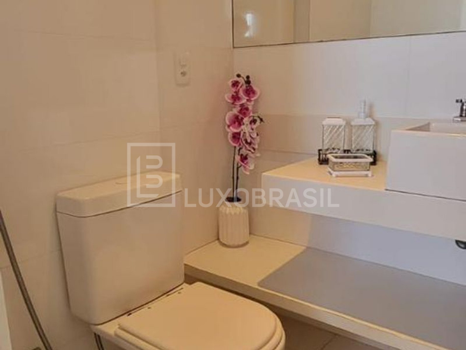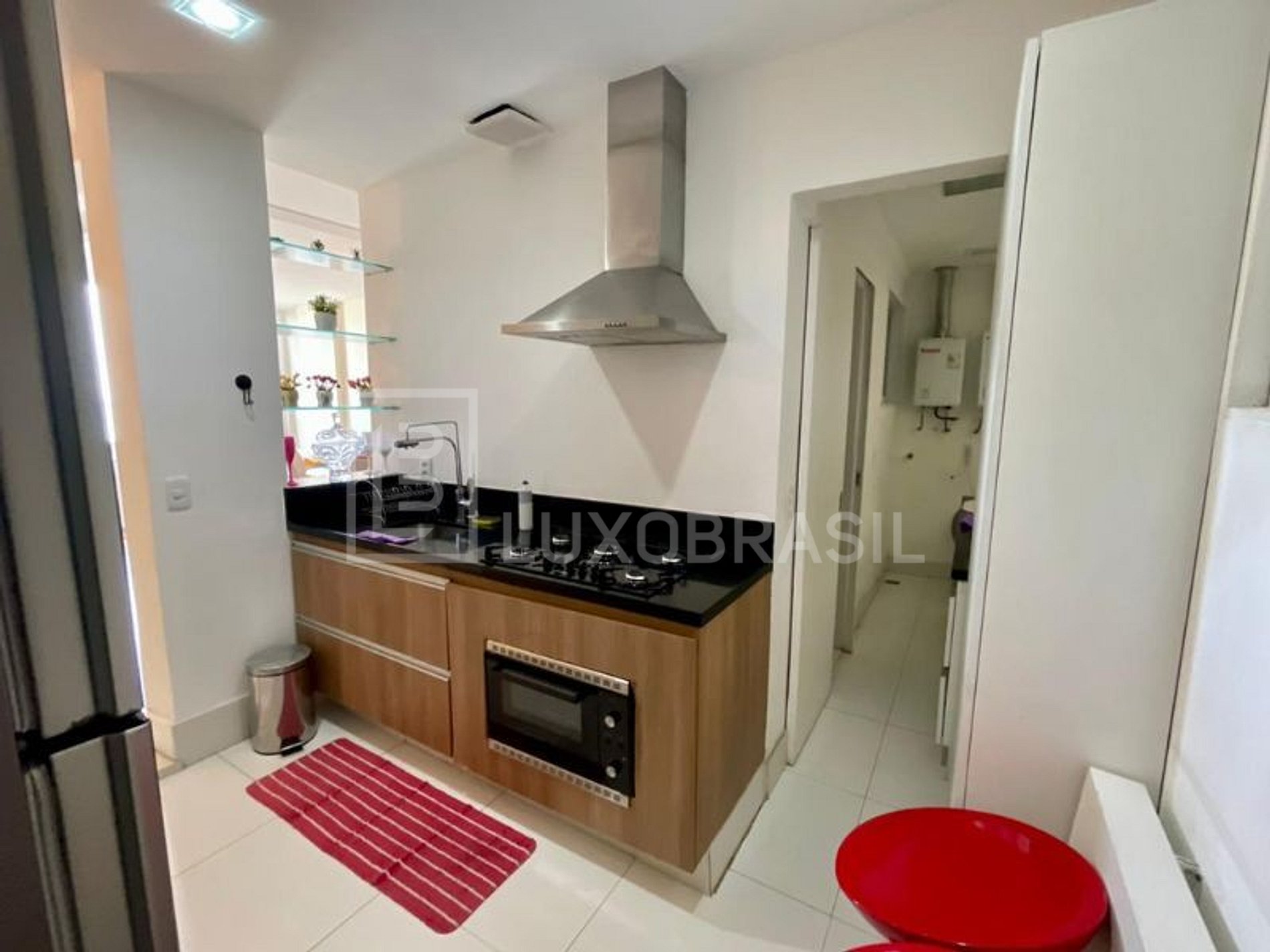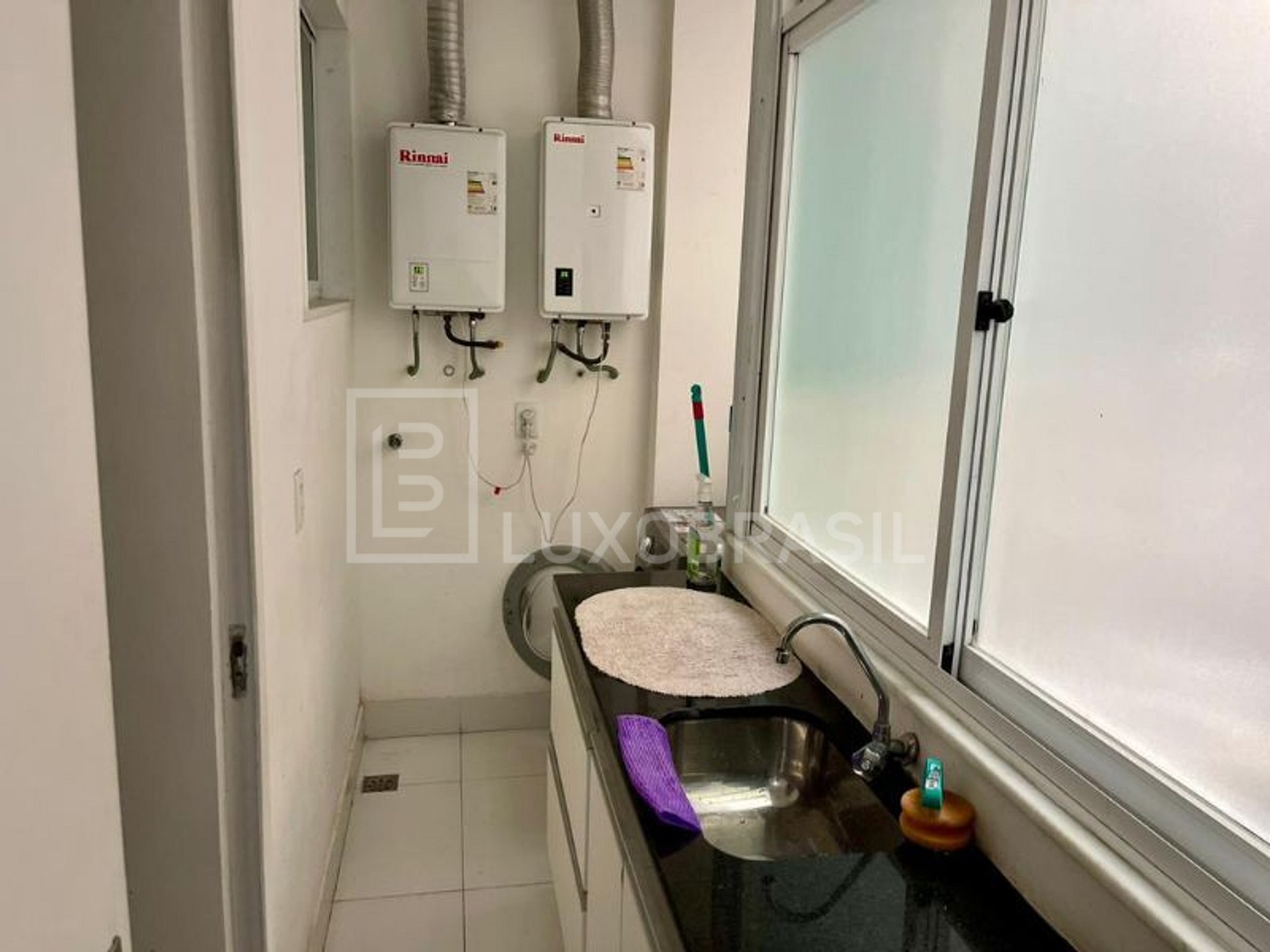 O imóvel, totalmente reformado, dispõe de três quartos, sendo duas suítes, três banheiros e um lavabo. A sala de estar e jantar é integrada à cozinha, criando um ambiente amplo e arejado. Além disso, há uma área de serviço com lavanderia e banheiro para funcionários. Todos os cômodos são com móveis planejados.