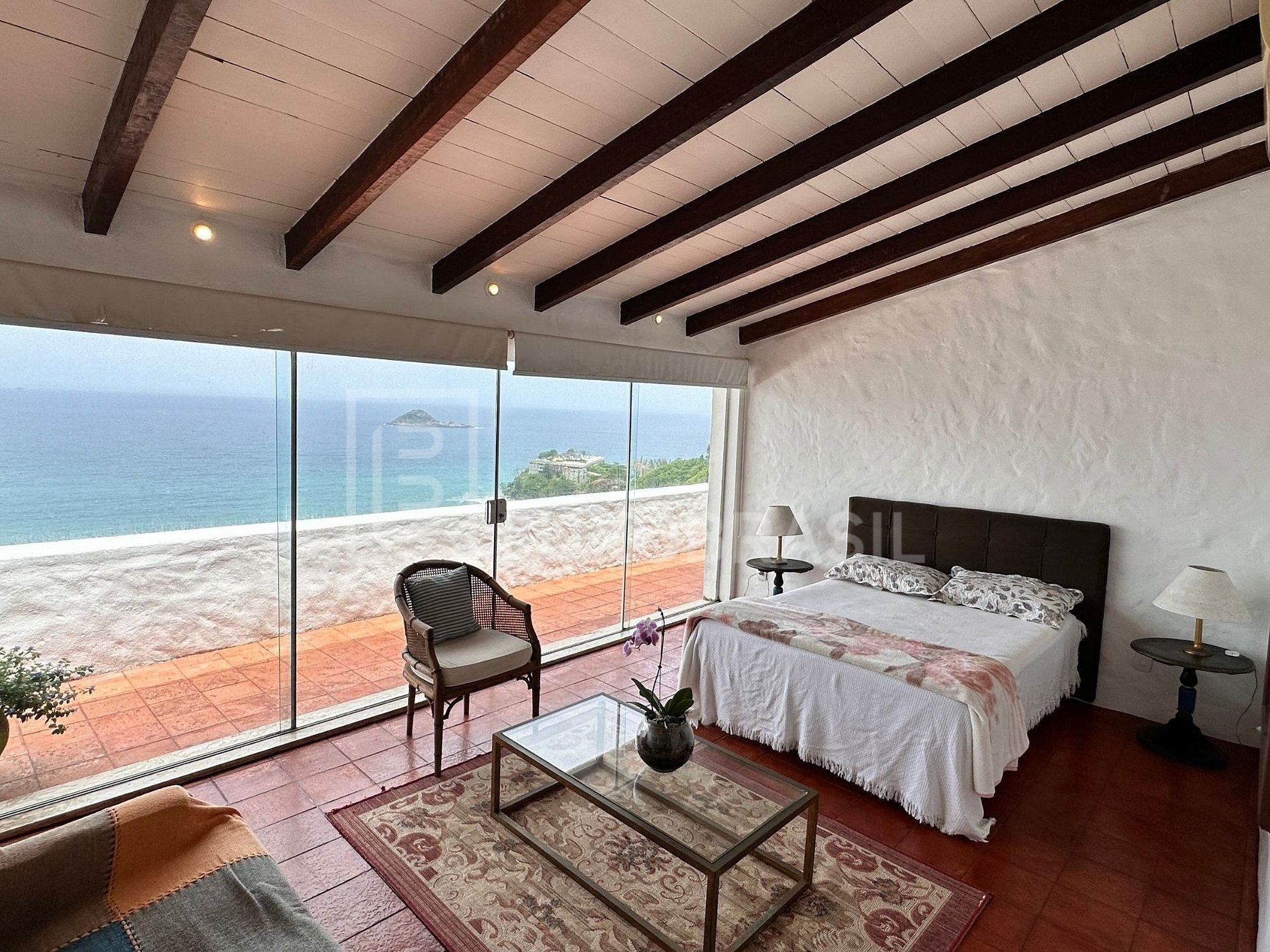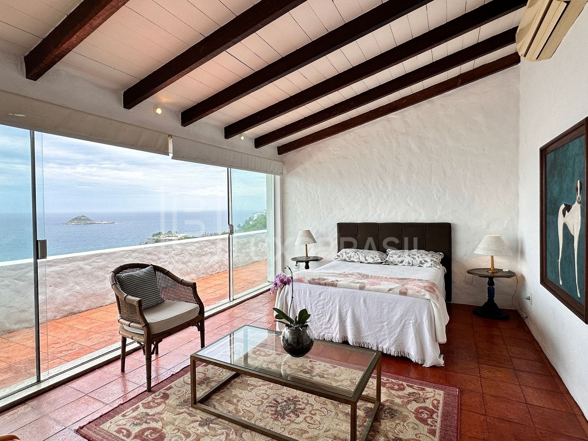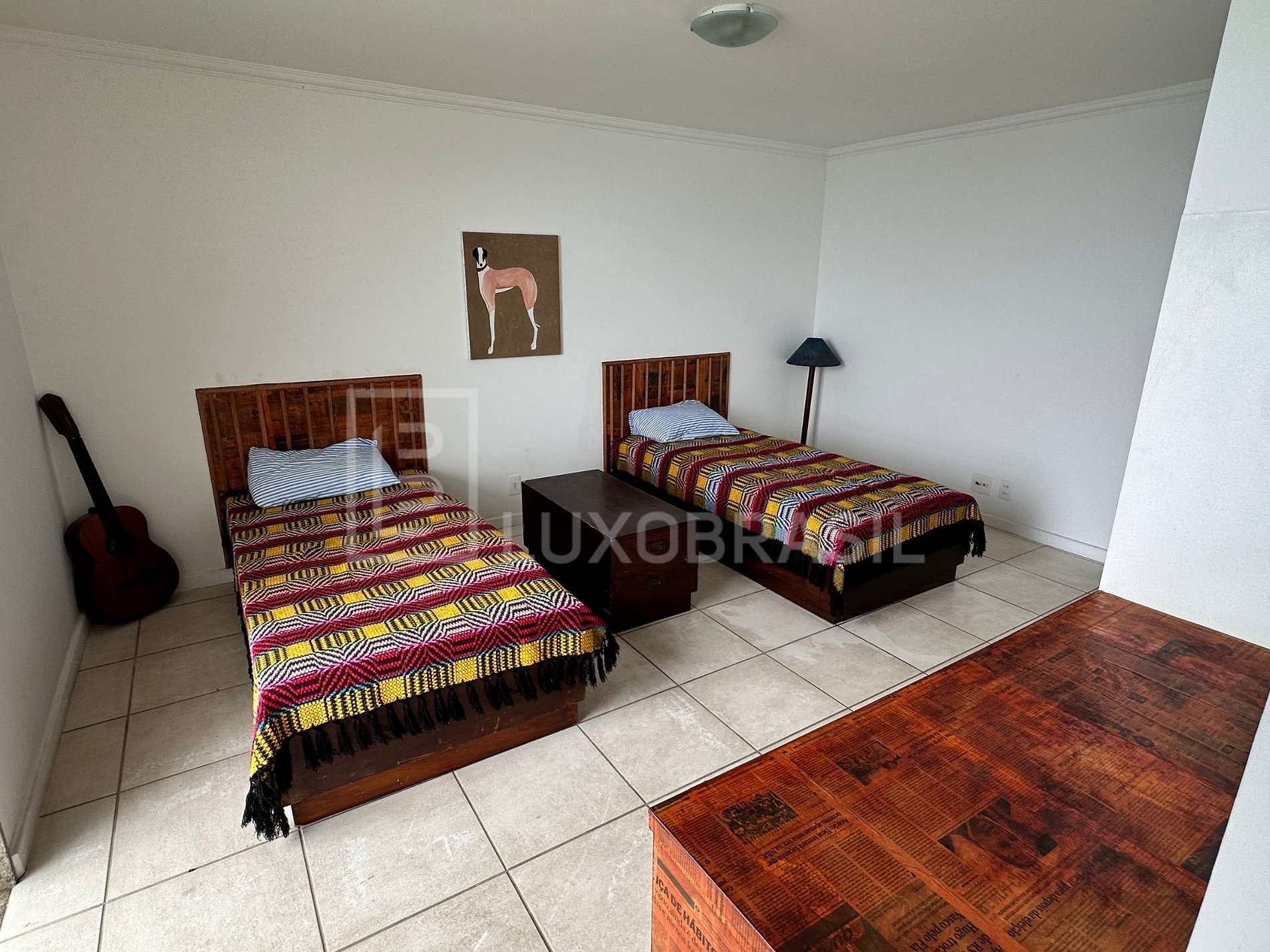 Uma escadaria culmina em um último andar descendo para piscina, onde há mais uma sala que pode ser utilizada como ateliê, com lavado e mais uma suíte com vista para a piscina, jardim e mar.