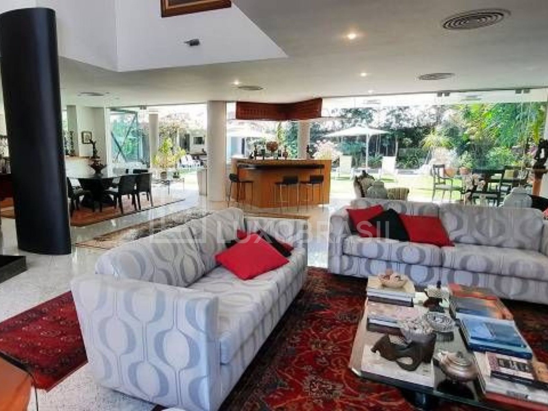 No primeiro pavimento, um espaçoso varandão, um grande salão dividido em três ambientes, um lavabo e um bar que serve de apoio à sala e à área externa. Há também uma suíte, uma copa e uma cozinha com ilha, além de uma dependência completa com área de serviço e lavanderia.