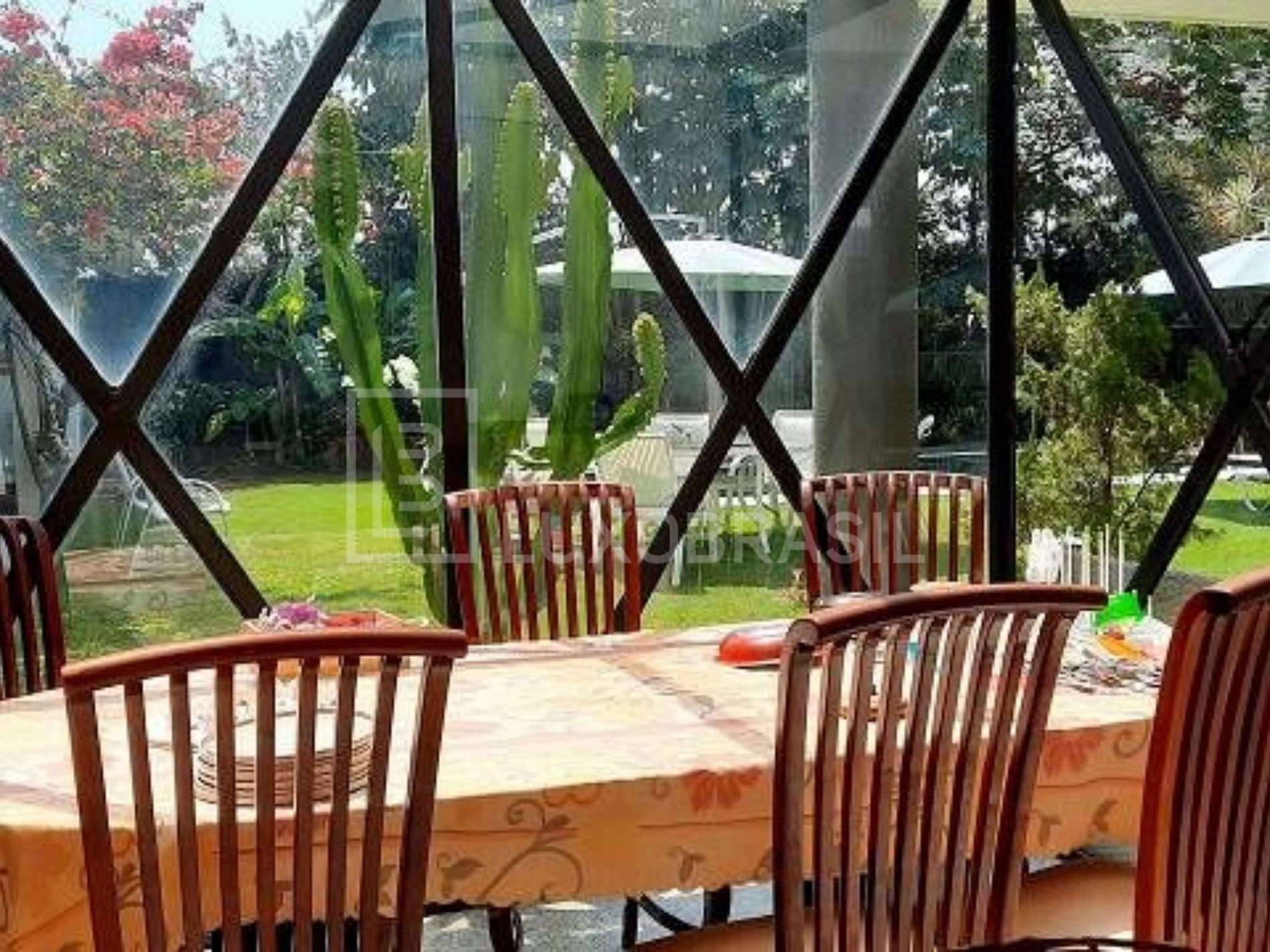 A área externa oferece um ambiente de lazer completo, com jardim, piscina, sauna, área gourmet, forno a lenha, churrasqueira e um banheiro. O imóvel ainda dispõe de cinco vagas de estacionamento, duas das quais são cobertas.