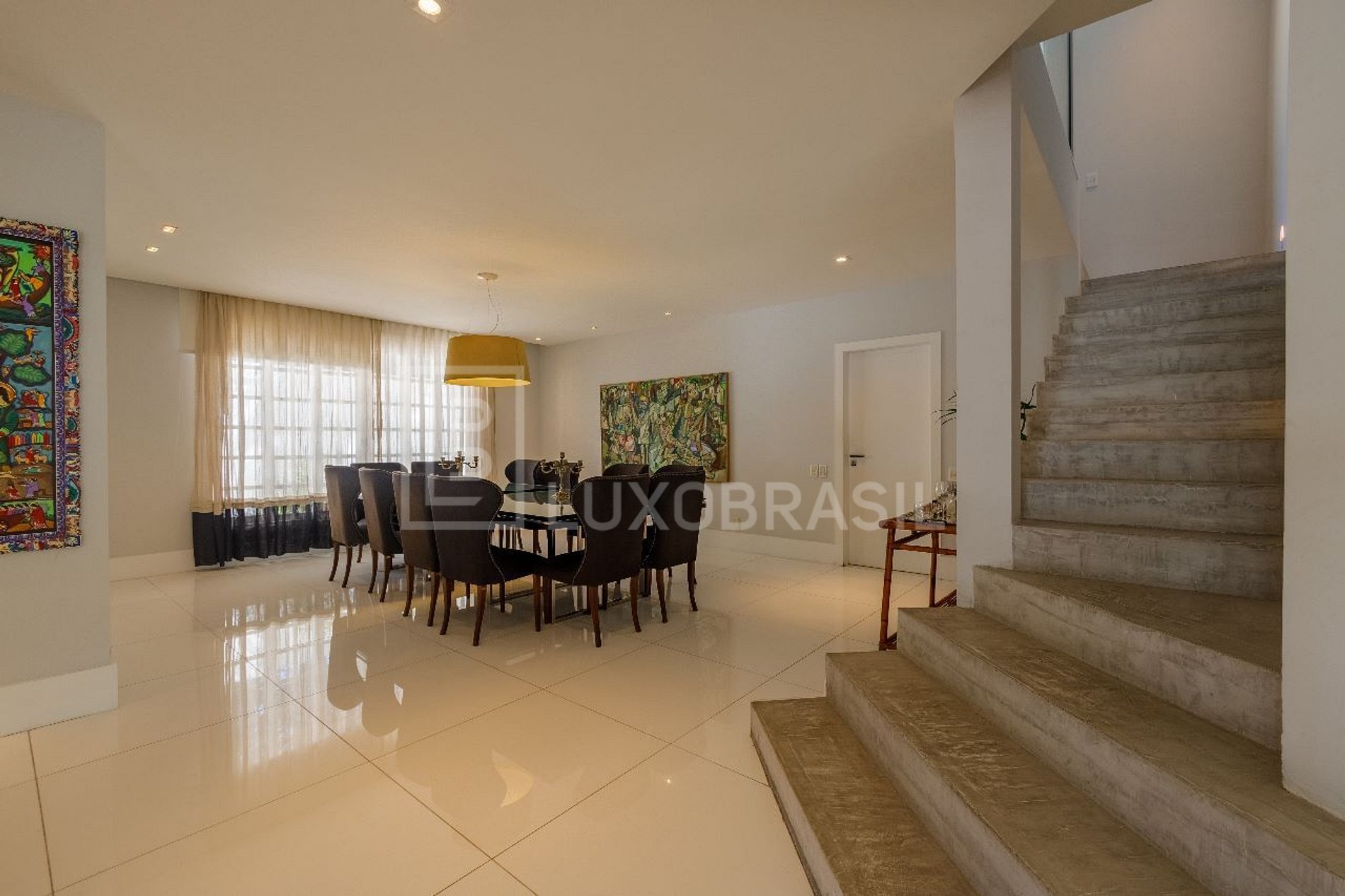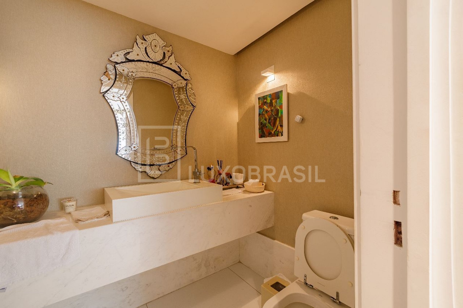 No interior, o imóvel revela um padrão incomparável de luxo e sofisticação. O acabamento em travertino confere uma elegância atemporal a cada espaço. O hall principal recebe os visitantes com sua imponência, enquanto um lavabo convenientemente localizado atende às necessidades dos convidados.
