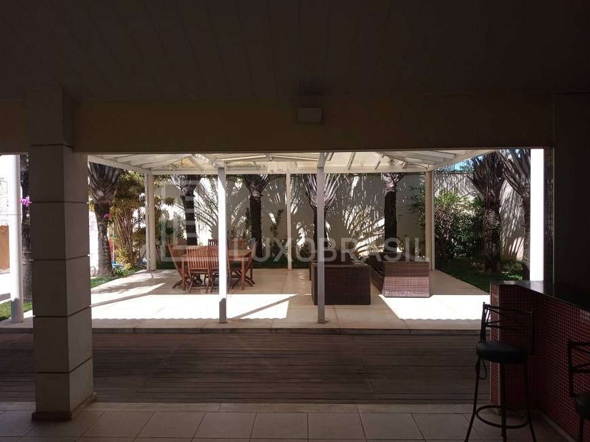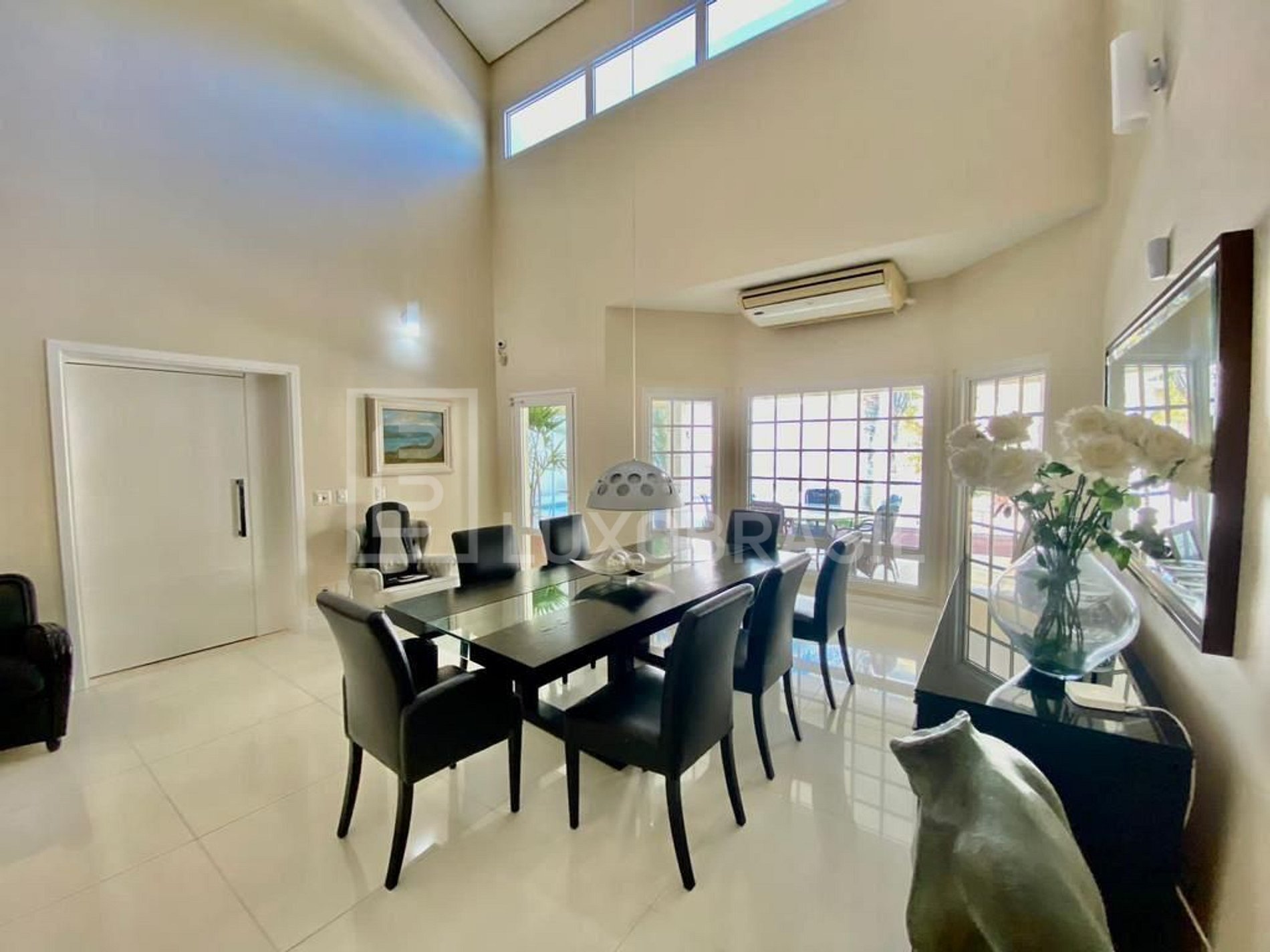 A área de lazer, localizada na parte posterior da casa, é cercada por um belo jardim e inclui uma varanda integrada ao espaço gourmet, com ilha e churrasqueira. Há também uma sala multiuso, podendo ser utilizada como espaço relaxante ou academia, e uma sauna com vista para a piscina. Completa-se com uma jacuzzi e chuveiro. Além disso, há uma edícula com móveis e 4 vagas de estacionamento cobertas.