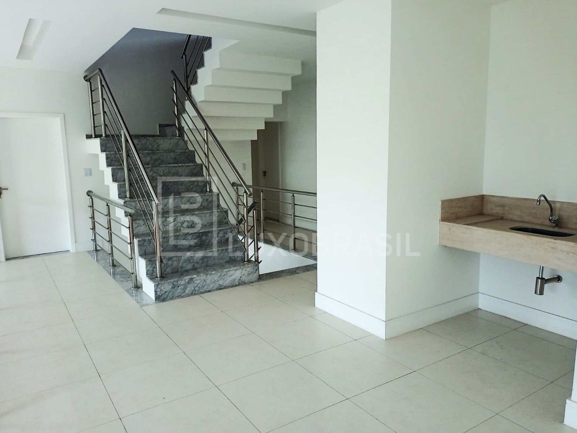 Subindo para o segundo pavimento, você encontrará uma sala íntima com uma mini copa de apoio e cinco suítes elegantes, todas com closet e piso frio. A suíte master se destaca com uma luxuosa banheira de hidromassagem e bancada dupla em mármore, complementada por porcelanato laminado até o teto.