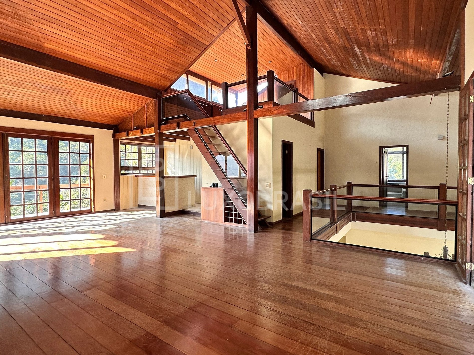 Nos andares superiores, a casa conta com 3 suítes, 2 closets, 2 salas, escritório, 3 banheiros, 2 lavabos, 4 varandas, cozinha, área de serviço e garagem com vagas cobertas e descobertas.