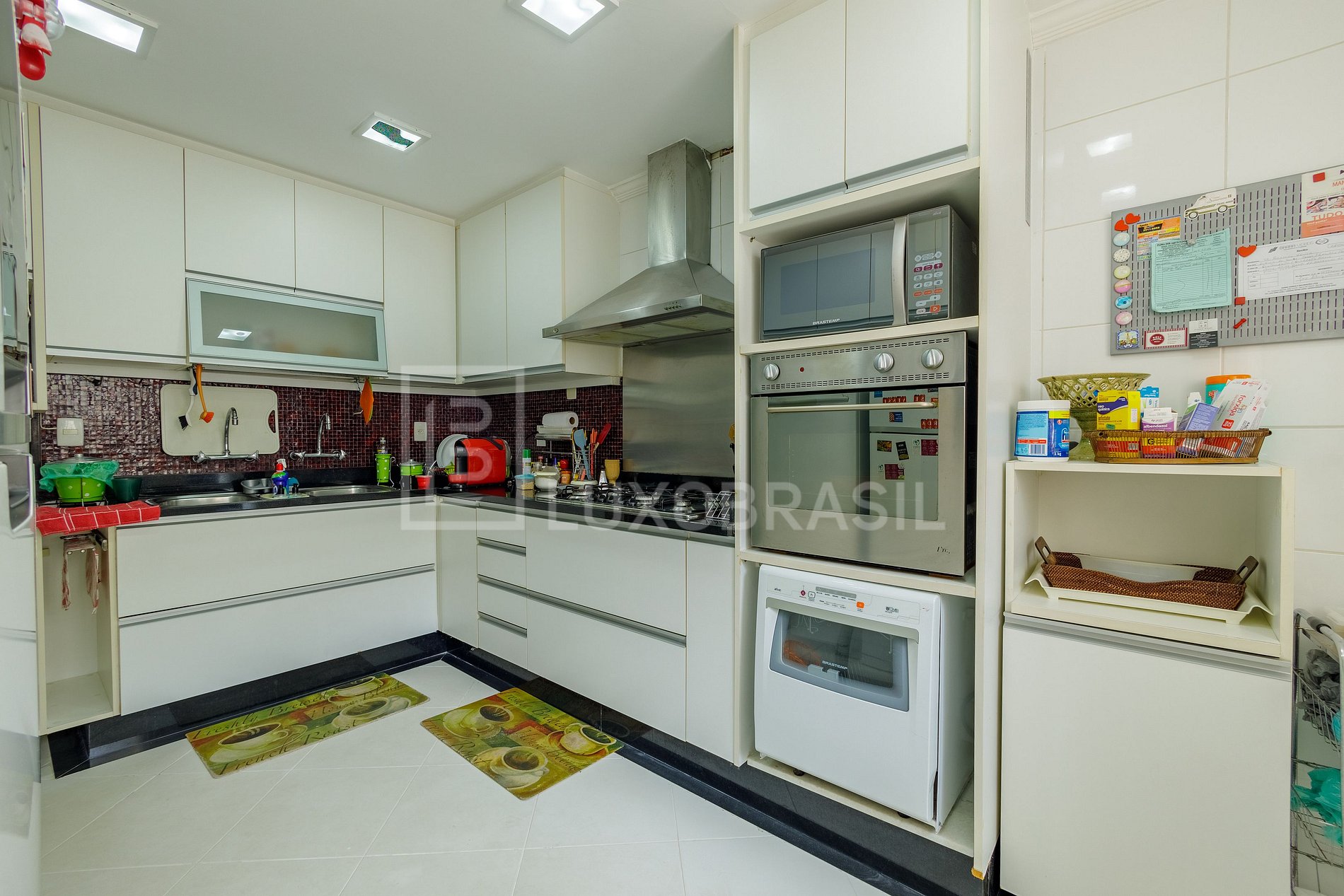 O imóvel conta com 06 quartos, sendo 03 suítes espaçosas e bem planejadas, sala de estar com excelente iluminação natural, sala de jantar, lavabo e escritório. A cozinha é moderna, com armários planejados e excelente circulação, complementada por uma área de serviço funcional com dependência completa.