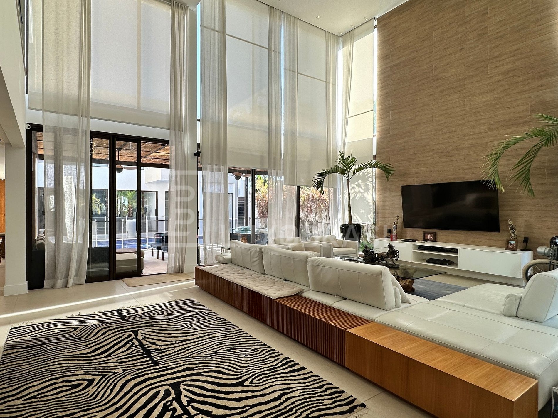 O primeiro andar oferece um suntuoso hall de entrada, salão principal com pé-direito de 7 metros, sala de jantar, dois lavabos, espaço gourmet com churrasqueira, adega, suíte de hóspedes com closet, sala de jogos, academia, cozinha com armários planejados da Romamobili e ilha central, além de despensa, lavanderia e dependência completa com dois quartos e um banheiro.