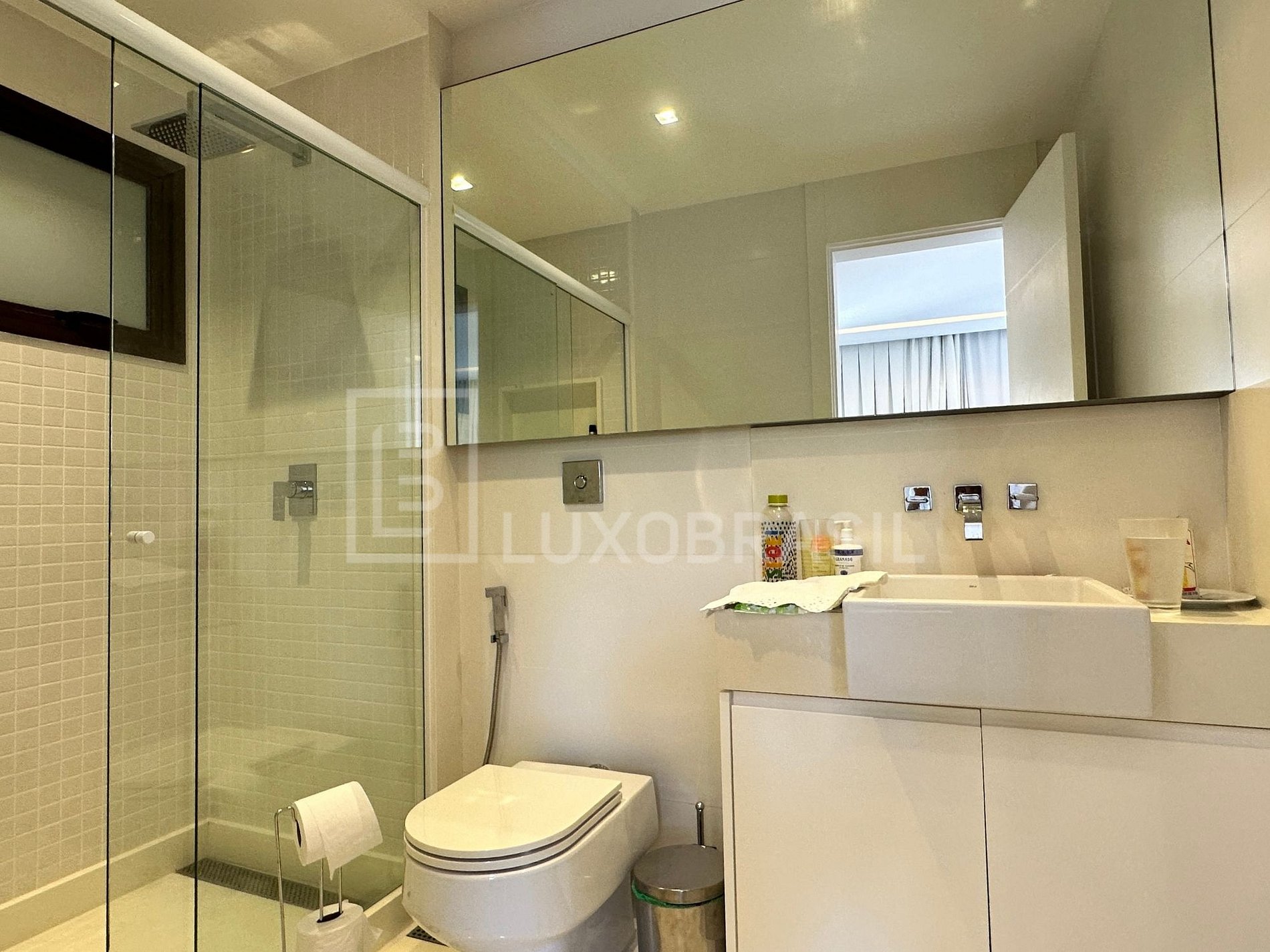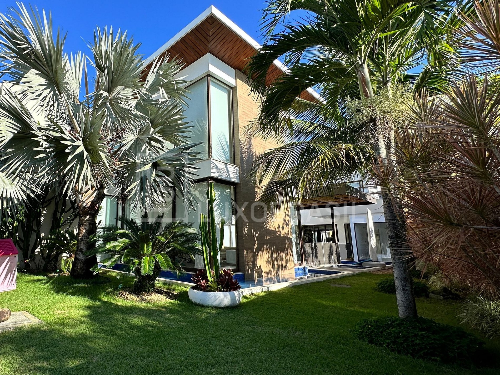 Na área externa, destaque para a piscina com deck seco e molhado, spa, sauna a vapor, banheiro de apoio, espelhos d’água ao redor da casa, garagem coberta para três carros e um belíssimo jardim paisagístico.